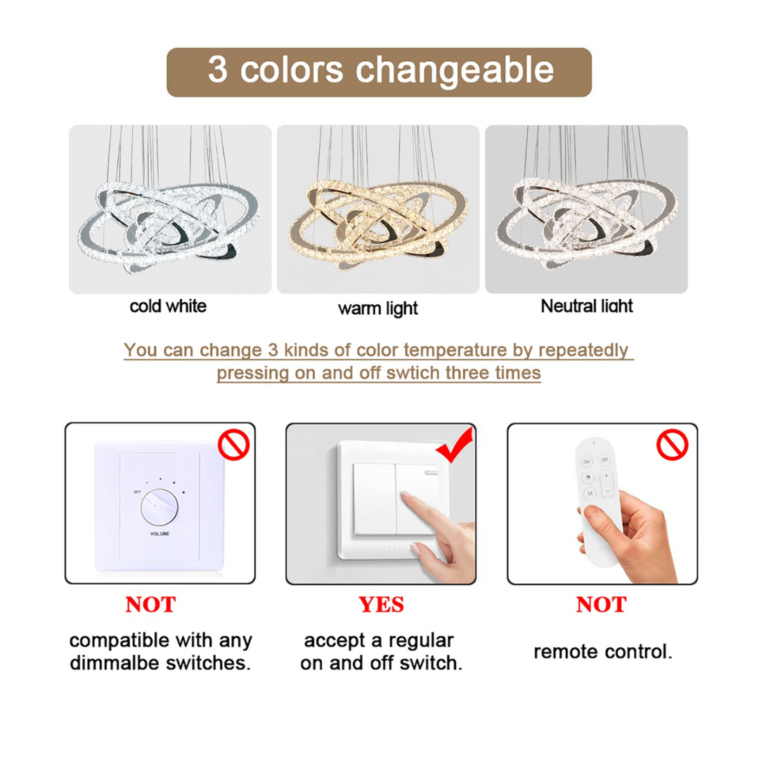 Elevate your interior with the SolivraHome 5-Ring Crystal Chandelier, a breathtaking statement piece featuring graduated chrome stainless steel and crystal rings in sizes 23.6″ / 19.7″ / 15.7″ / 11.8″ / 7.9″. This cascading design delivers 7070 lumens of brilliance with three adjustable color temperatures (3500K / 4100K / 6000K) for a customizable lighting experience.